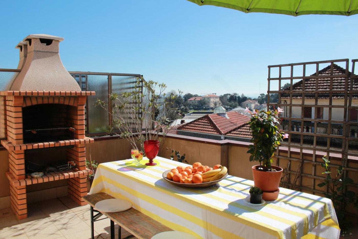 Apartamento com Terraço. This apartment includes a bedroom with 2 double beds and a living room with a double sofa bed, a flat-screen cable TV and free WiFi. The private bathroom has a bath, a shower and a hairdryer. Guests have access to a terrace overlooking the city that features a table, chairs and sun loungers. The fully equipped kitchen allows self-catering. Barbecue facilities are only available in the apartments situated on the 4th floor.